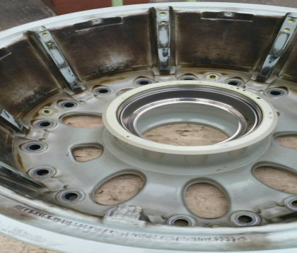 ![]() 需要翻新處理的飛機輪轂外形尺寸:Φ450-700*H140-400mm (看看,才幾天的飛行,飛機起降對輪胎、輪轂的沖擊有多大!) 噴砂后接受探傷檢測時的輪轂,讓損傷一覽無余!