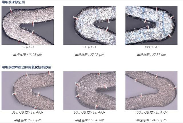 經(jīng)過吉川公司工藝工程師測試,用氧化鋁砂進(jìn)行定向的噴砂處理可以去除氧化層,平滑表面缺陷并改善外圍支架的表面質(zhì)量。支架的受損區(qū)域很脆,但基礎(chǔ)材料鎳鈦諾卻具有延展性。氧化鋁噴砂磨料使用去氧化層,并且對韌性基體的侵蝕最小,從而在支架撐桿的整個長度上形成均勻的表面光潔度。 市場最新的支架設(shè)計和醫(yī)療植入物要求更大的邊緣倒圓角。圓形邊緣降低了被植入物卡住,其他風(fēng)險的可能性。氧化鋁微噴丸的半徑為5-15 m,但新的幾何尺寸指定為接近25 m。該半徑可以通過三種途徑實現(xiàn):延長噴砂周期,使用更大尺寸的氧化鋁或完全使用其他磨料。通過測試,我們了解到更長的噴砂周期可以去除更多的團(tuán)塊,而較大尺寸的氧化鋁會產(chǎn)生過于粗糙而無法拋光的表面。畢竟,氧化鋁顆粒的形狀為塊狀,邊緣稍尖。這給了我們一個可行的選擇:嘗試使用其他類型的磨料。為了克服這一障礙,我們測試了幾種類型的介質(zhì),發(fā)現(xiàn)用玻璃珠噴砂可以在拐角處形成所需的半徑(最大30 m),而不會除去設(shè)備的額外質(zhì)量。結(jié)果是氧化鋁的質(zhì)量提高了十倍。經(jīng)過吉川公司工藝工程師的測試事實說明了結(jié)果的差異。用氧化鋁噴砂處理過的樣品的半徑僅為8-13 m,而用玻璃珠噴砂處理過的樣品的半徑為24-30 m。 經(jīng)過吉川公司工藝工程師最終測試事實證明,最好的心臟支架噴砂工藝需要用氧化鋁砂粗噴砂、再用玻璃珠微噴砂是目前最好的一種噴砂工藝方式。 經(jīng)過粗噴、微噴的產(chǎn)品外徑和內(nèi)徑轉(zhuǎn)角處的半徑可以實現(xiàn),而所需的附加材料去除最少。半徑的大小可以有效地控制,因為它是基于圓形磨料,玻璃珠的大小和速度的。可以控制具有附加半徑的支架區(qū)域。通過機械加工表面,有助于保持支架的疲勞壽命。玻璃珠磨料通常用于必須保持嚴(yán)格公差的噴丸處理應(yīng)用中。玻璃珠對支架表面進(jìn)行噴丸處理,不會去除任何材料或數(shù)量可忽略不計的材料。如下所示,玻璃珠的尺寸很重要。玻璃珠的尺寸越大;邊緣越圓。玻璃珠有35 ,50 和100 兩種。讓我們看一下使用每種尺寸的樣本測試的結(jié)果。此處顯示的未噴砂的支架表面(500x)邊緣鋒利,并受到制造損壞。半徑范圍僅為3-8 m。為什么用兩種磨料處理比單獨用氧化鋁處理好? 玻璃珠無法消除制造過程中產(chǎn)生的浮渣,回彈和其他損壞;只有氧化鋁可以。氧化鋁不能產(chǎn)生真正的圓形邊緣。但是,它確實可以提供電拋光所需的理想表面光潔度。一個不能替代另一個。通過使用多步驟過程,植入物表面可以使用經(jīng)過驗證的相同設(shè)備獲得兩全其美的效果。在該過程中添加第二種研磨劑聽起來可能需要更多的勞動力,但實際上比其他修邊過程更有效。例如,電拋光可以產(chǎn)生較大的半徑,但它也會從整個零件中去除過多的材料,而不僅僅是角部,從而損害了支架的疲勞壽命。